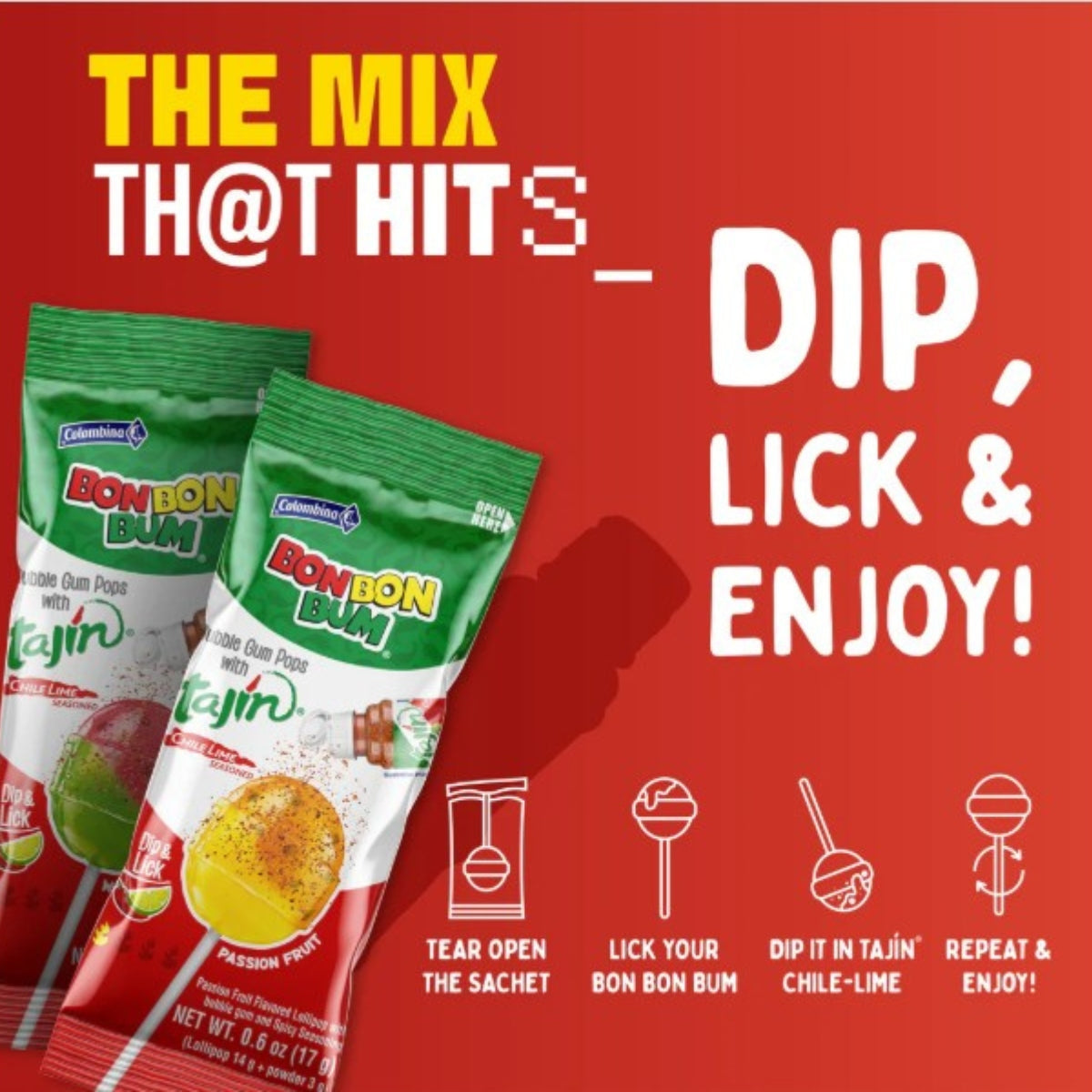 Las paletas Bon Bon Bum de Colombina se reinventan con el toque único del chile Tajín. Una deliciosa combinación de sabores frutales con lo dulce, acidito y picosito en cada mordida. Presentación 1/20 ct, ideal para compartir, regalar o vender.